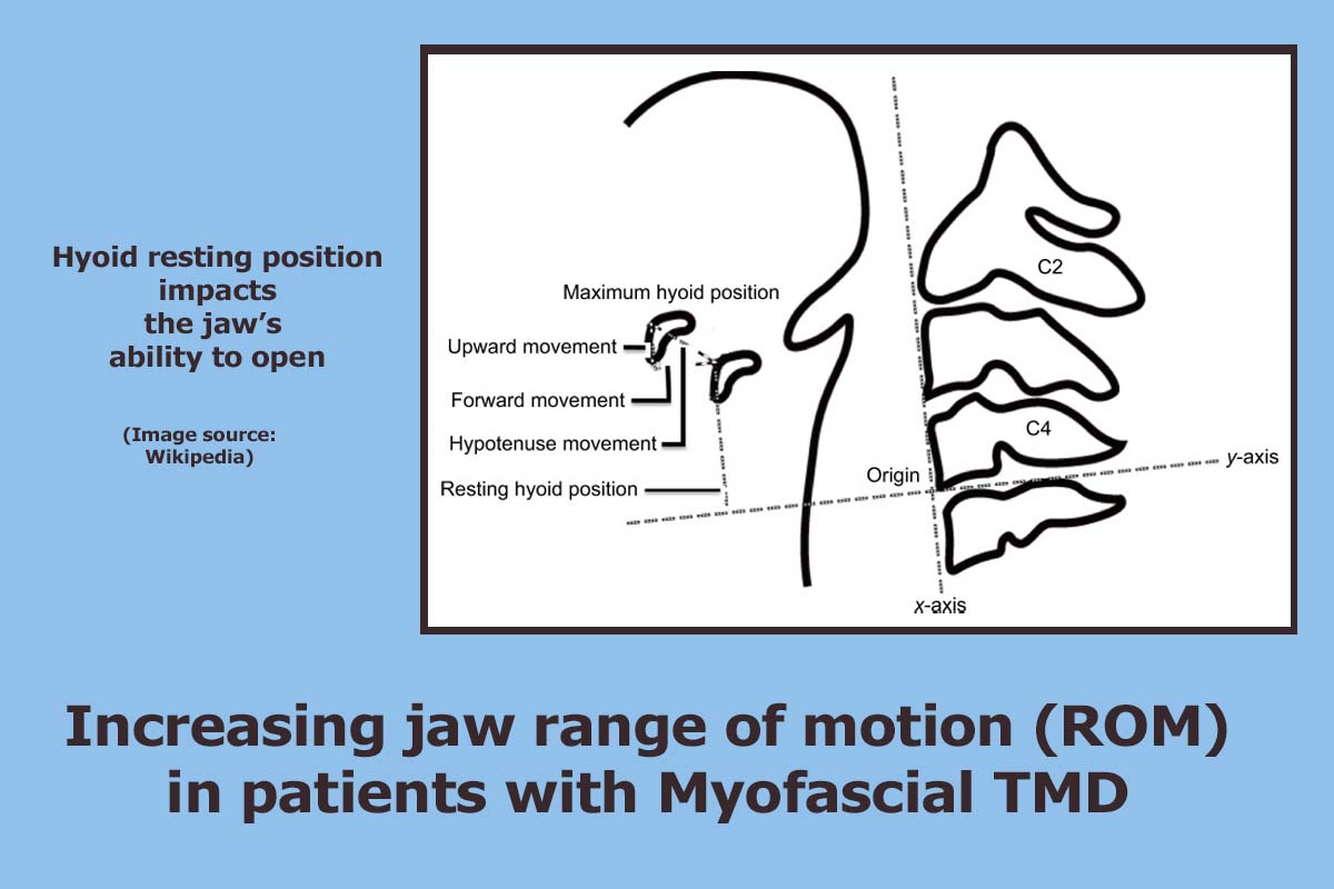 “As for jaw opening force, hyoid resting position and hyoid dynamics are very important and are considered to be affected directly by the suprahyoid muscles. MFR is found to be effective in giving symptomatic relief and increasing jaw ROM in patients with myofascial TMD. [4]